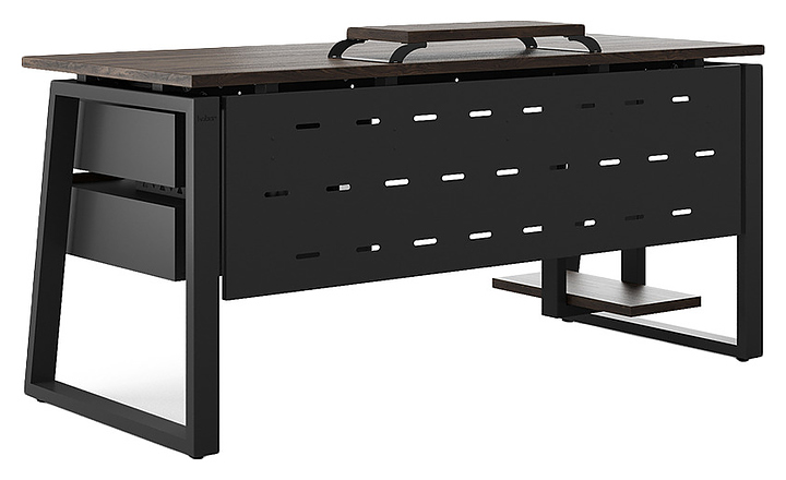 Компьютерный стол Кобор KTS1-100/70 black/charlston используется в офисных помещениях и кабинетах руководителей. Модель оснащена опорами в форме наклонной трапеции. Каркас выполнен из металла, выкрашенного в цвет черный муар (RAL9005), столешница – из ламинированной древесно-стружечной плиты (ЛДСП) цвета дуб чарльстон (H3154 ST36). Опции (заказываются отдельно):