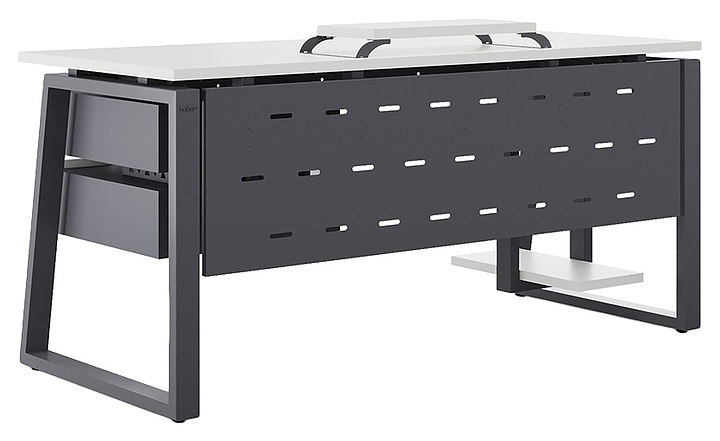 Компьютерный стол Кобор KTS1-120/60 graphite/premium используется в офисных помещениях и кабинетах руководителей. Модель оснащена опорами в форме наклонной трапеции. Каркас выполнен из металла, выкрашенного в цвет графит муар (RAL7024), столешница – из ламинированной древесно-стружечной плиты (ЛДСП) цвета белый премиум (W1000 ST9). Опции (заказываются отдельно):