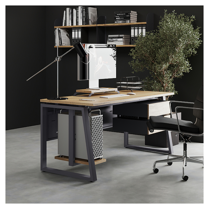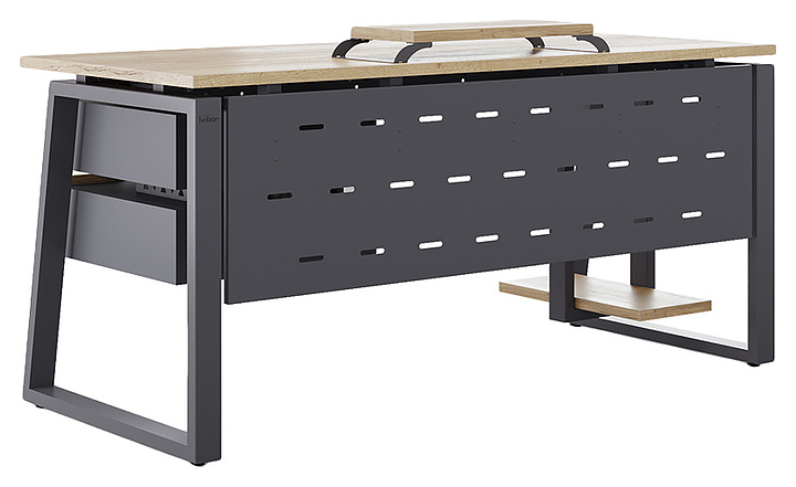Компьютерный стол Кобор КTS1-140/70 graphite/natural используется в офисных помещениях и кабинетах руководителей. Модель оснащена опорами в форме наклонной трапеции. Каркас выполнен из металла, выкрашенного в цвет графит муар (RAL7024), столешница – из ламинированной древесно-стружечной плиты (ЛДСП) цвета натуральный дуб (H1180 ST37). Опции (заказываются отдельно):