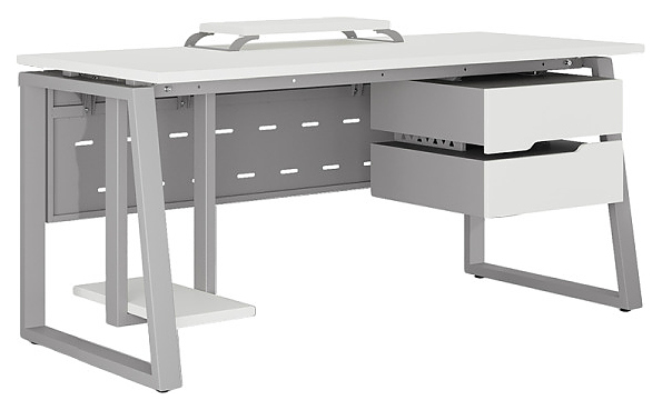 Компьютерный стол Кобор КTS1-160/70 aluminum/premium используется в офисных помещениях и кабинетах руководителей. Модель оснащена опорами в форме наклонной трапеции. Каркас выполнен из металла, выкрашенного в цвет алюминиевый металлик (RAL9006), столешница – из ламинированной древесно-стружечной плиты (ЛДСП) цвета белый премиум (W1000 ST9). Опции (заказываются отдельно):