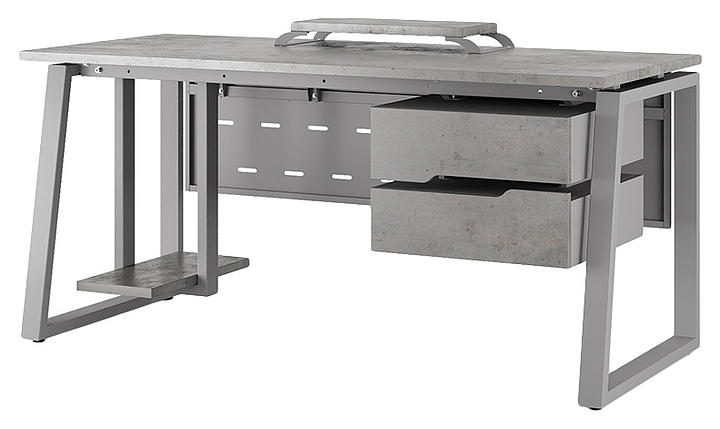 Компьютерный стол Кобор КTS1-120/60 aluminum/chicago используется в офисных помещениях и кабинетах руководителей. Модель оснащена опорами в форме наклонной трапеции. Каркас выполнен из металла, выкрашенного в цвет алюминиевый металлик (RAL9006), столешница – из ламинированной древесно-стружечной плиты (ЛДСП) цвета бетон чикаго (F186 ST9). Опции (заказываются отдельно):