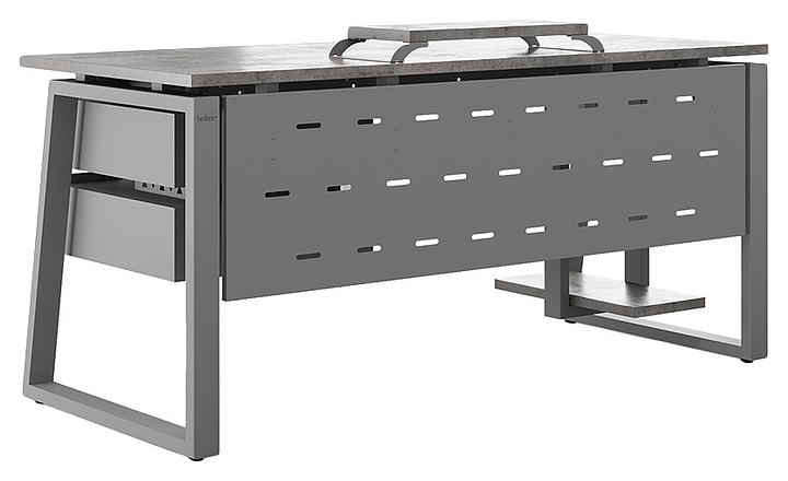 Компьютерный стол Кобор КTS1-180/80 aluminum/chicago используется в офисных помещениях и кабинетах руководителей. Модель оснащена опорами в форме наклонной трапеции. Каркас выполнен из металла, выкрашенного в цвет алюминиевый металлик (RAL9006), столешница – из ламинированной древесно-стружечной плиты (ЛДСП) цвета бетон чикаго (F186 ST9). Опции (заказываются отдельно):