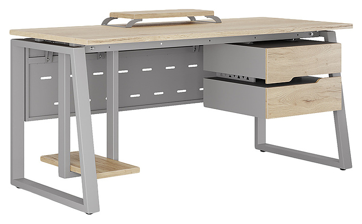 Компьютерный стол Кобор KTS1-140/80 aluminum/natural используется в офисных помещениях и кабинетах руководителей. Модель оснащена опорами в форме наклонной трапеции. Каркас выполнен из металла, выкрашенного в цвет алюминиевый металлик (RAL9006), столешница – из ламинированной древесно-стружечной плиты (ЛДСП) цвета натуральный дуб (H1180 ST37). Опции (заказываются отдельно):
