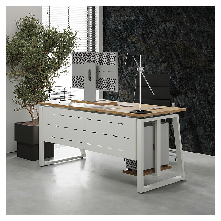 Компьютерный стол Кобор КTS1-160/80 white/natural используется в офисных помещениях и кабинетах руководителей. Модель оснащена опорами в форме наклонной трапеции. Каркас выполнен из металла, выкрашенного в цвет белый муар (RAL9016), столешница – из ламинированной древесно-стружечной плиты (ЛДСП) цвета натуральный дуб (H1180 ST37). Опции (заказываются отдельно):