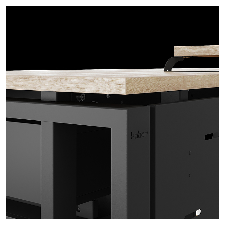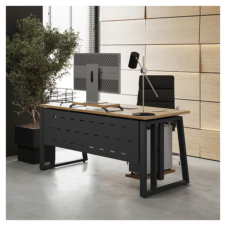 Компьютерный стол Кобор КTS2-100/80 black/natural используется в офисных помещениях и кабинетах руководителей. Модель оснащена усиленными вертикальными балками опорами в форме наклонной трапеции. Каркас выполнен из металла, выкрашенного в цвет черный муар (RAL9005), столешница – из ламинированной древесно-стружечной плиты (ЛДСП) цвета натуральный дуб (H1180 ST37). Опции (заказываются отдельно):