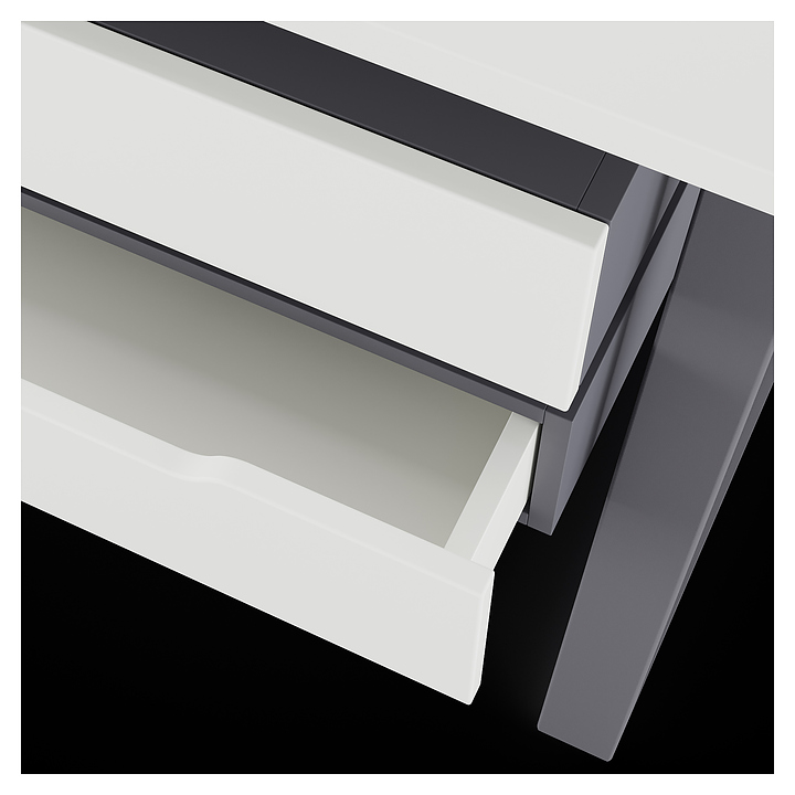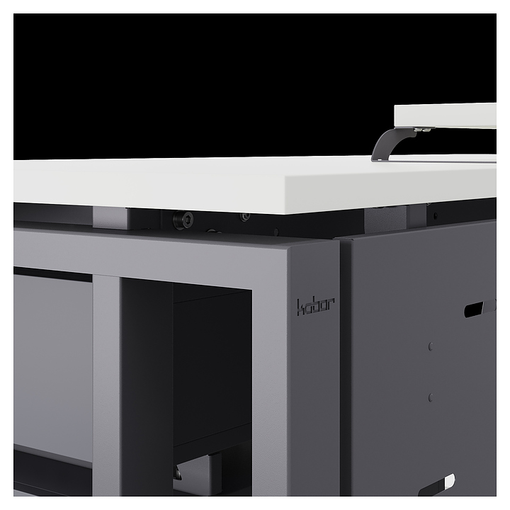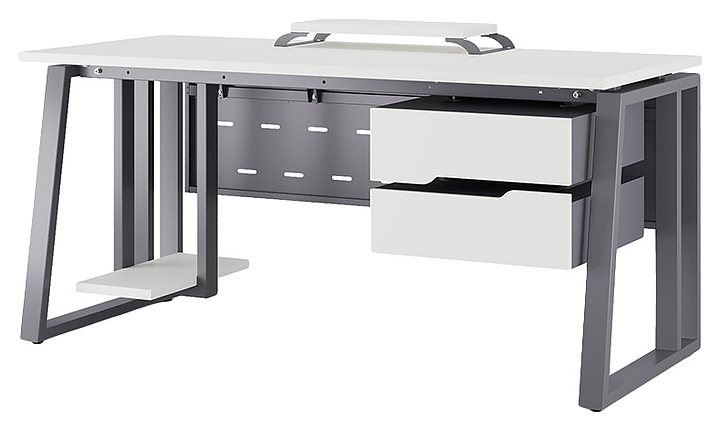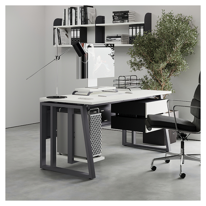 Компьютерный стол Кобор КTS2-100/80 graphite/premium используется в офисных помещениях и кабинетах руководителей. Модель оснащена усиленными вертикальными балками опорами в форме наклонной трапеции. Каркас выполнен из металла, выкрашенного в цвет графит муар (RAL7024), столешница – из ламинированной древесно-стружечной плиты (ЛДСП) цвета белый премиум (W1000 ST9). Опции (заказываются отдельно):