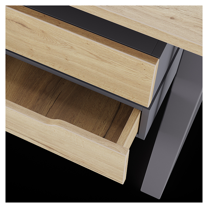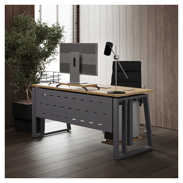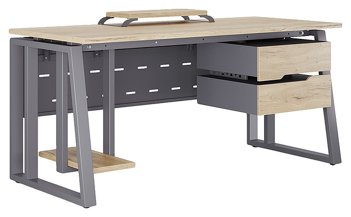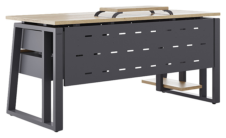 Компьютерный стол Кобор КTS2-100/80 graphite/natural используется в офисных помещениях и кабинетах руководителей. Модель оснащена усиленными вертикальными балками опорами в форме наклонной трапеции. Каркас выполнен из металла, выкрашенного в цвет графит муар (RAL7024), столешница – из ламинированной древесно-стружечной плиты (ЛДСП) цвета натуральный дуб (H1180 ST37). Опции (заказываются отдельно):