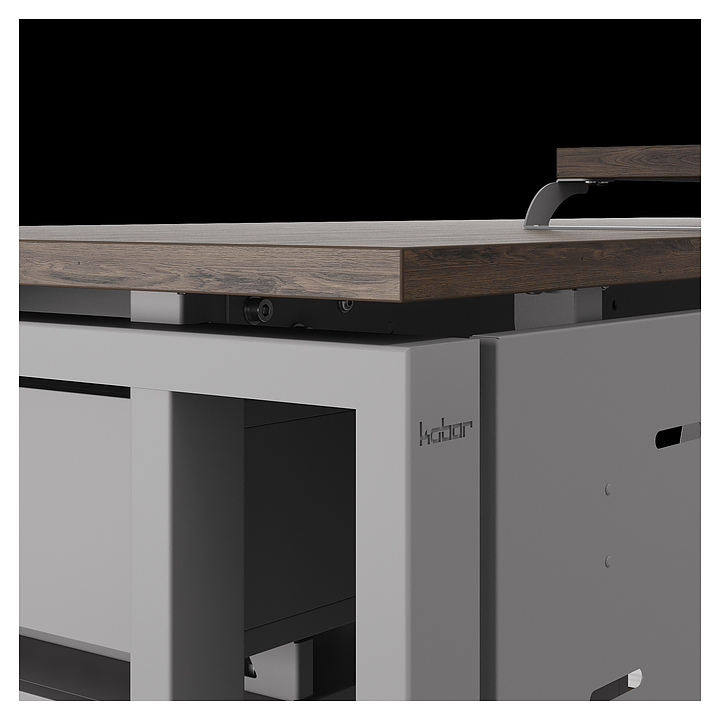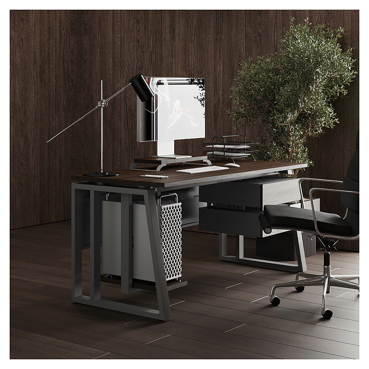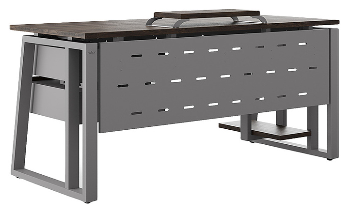 Компьютерный стол Кобор KTS2-120/60 aluminum/charlston используется в офисных помещениях и кабинетах руководителей. Модель оснащена усиленными вертикальными балками опорами в форме наклонной трапеции. Каркас выполнен из металла, выкрашенного в цвет алюминиевый металлик (RAL9006), столешница – из ламинированной древесно-стружечной плиты (ЛДСП) цвета дуб чарльстон (H3154 ST36). Опции (заказываются отдельно):