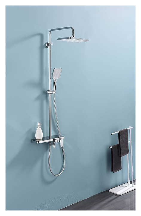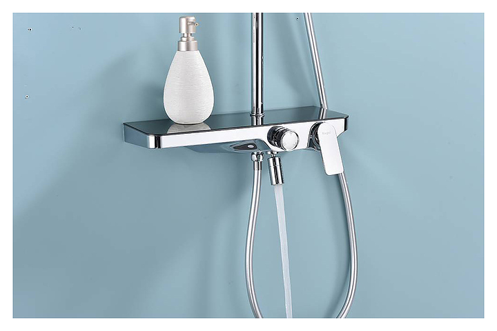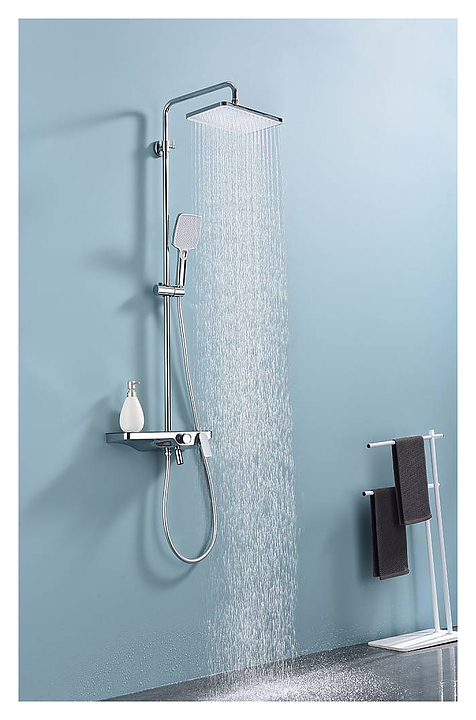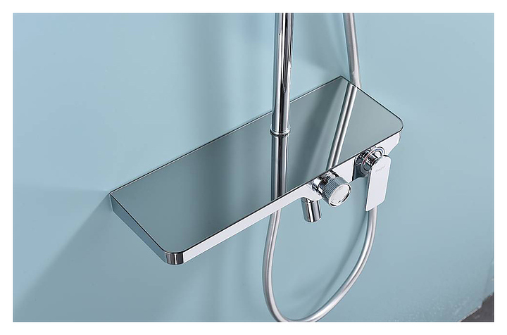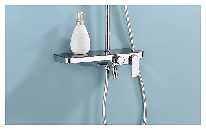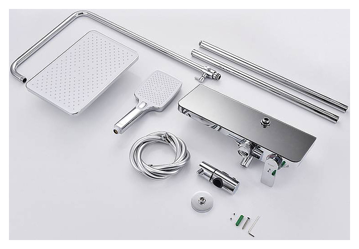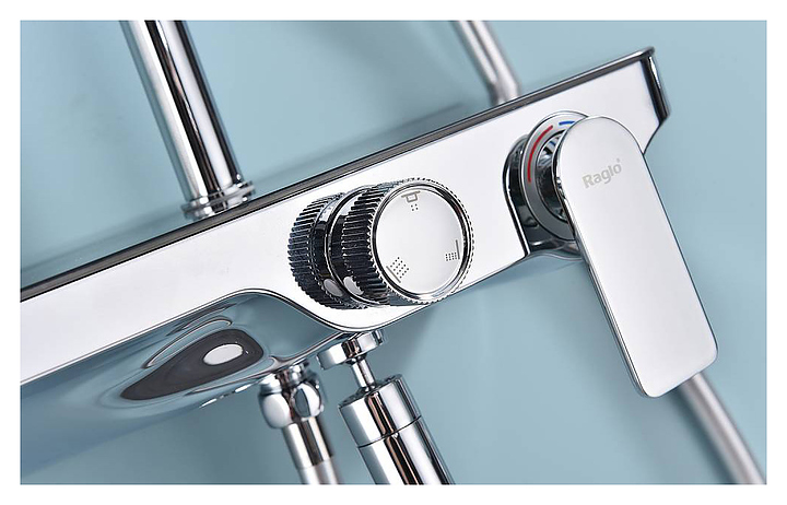 Душевая система Raglo R60.24 предназначена для подачи горячей и холодной воды в ванных помещениях. Модель оснащена полкой, регулируемой по высоте душевой штангой, прямоугольными верхним душем и ручной лейкой. Керамический картридж обеспечивает плавный ход рычага смесителя, контроль и точность при выборе напора и температуры воды. Скрытый излив оснащен аэратором, который создает мягкую струю без брызг. Изделие выполнено из высококачественной латуни, отличающейся прочностью, долговечностью и устойчивостью к перепадам температур, шланг - из металла, полка - из стекла. В комплект поставки входят верхний душ, душевая штанга с держателем лейки, ручной душ, смеситель и шланг. Особенности: