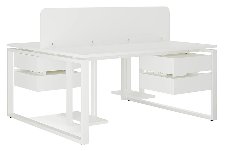 Офисный стол Кобор O1/2-100/120 white/premium на 2 рабочих места используется в офисных помещениях и кабинетах руководителей. Модель оснащена O-образными опорами. Каркас и опоры выполнены из металла, выкрашенного в цвет белый муар (RAL9016), столешница – из ламинированной древесно-стружечной плиты (ЛДСП) цвета белый премиум (W1000 ST9). Дополнительные характеристики: