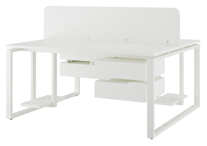 Офисный стол Кобор O1/2-100/140 white/premium на 2 рабочих места используется в офисных помещениях и кабинетах руководителей. Модель оснащена O-образными опорами. Каркас и опоры выполнены из металла, выкрашенного в цвет белый муар (RAL9016), столешница – из ламинированной древесно-стружечной плиты (ЛДСП) цвета белый премиум (W1000 ST9). Дополнительные характеристики: