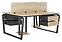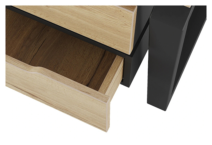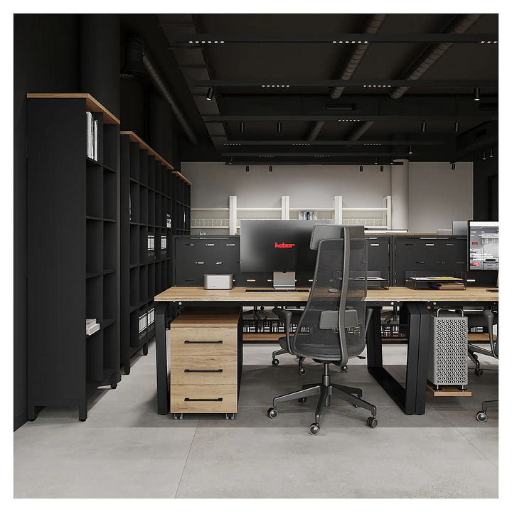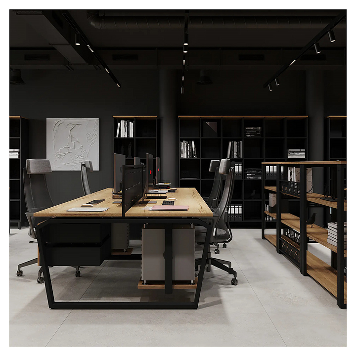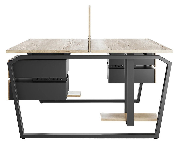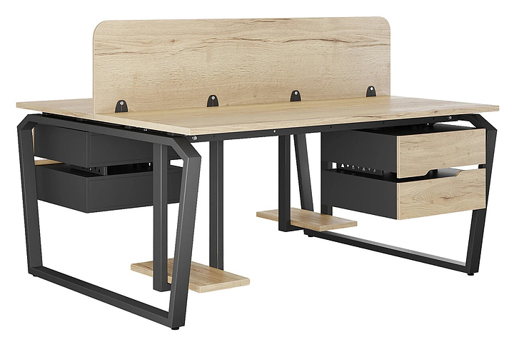 Офисный стол Кобор TB/2-80/160 black/natural на 2 рабочих места используется в офисных помещениях и кабинетах руководителей. Модель оснащена опорами в форме обратной трапеции со скошенными верхними углами. Каркас и опоры выполнены из металла, выкрашенного в цвет черный муар (RAL9005), столешница – из ламинированной древесно-стружечной плиты (ЛДСП) цвета натуральный дуб (H1180 ST37). Дополнительные характеристики: