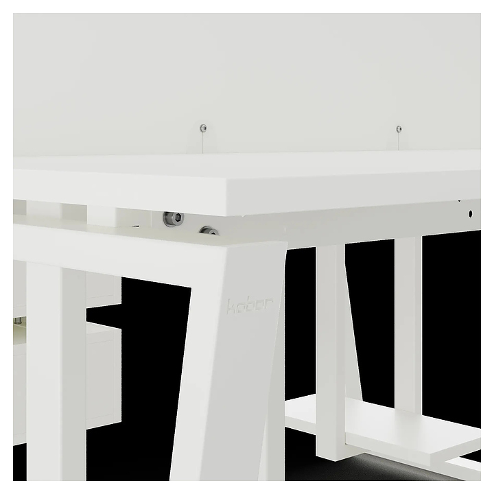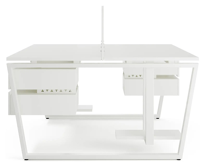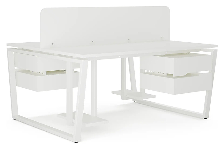 Офисный стол Кобор OTR/2-80/160 white/premium на 2 рабочих места используется в офисных помещениях и кабинетах руководителей. Модель оснащена опорами в форме обратной трапеции. Каркас и опоры выполнены из металла, выкрашенного в цвет белый муар (RAL9016), столешница – из ламинированной древесно-стружечной плиты (ЛДСП) цвета белый премиум (W1000 ST9). Дополнительные характеристики:
