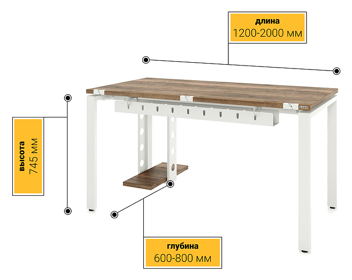 Прямой офисный стол ZAMM 60х30 серии Формат ТР используется для организации рабочего пространства в офисных помещениях. Коллекция отличается современным дизайном и сочетает в себе стиль и функциональность, создавая современное офисное пространство, стимулирующее продуктивность. Модель оснащена столешницей прямоугольной формы и П-образными опорами с подпятниками для компенсации неровностей пола. Каркас выполнен из холоднокатаной стали с покрытием белого цвета, столешница - из высококачественной ламинированной древесно-стружечной плиты (ЛДСП) с поверхностью цвета дуб галифакс олово. Комплектация: