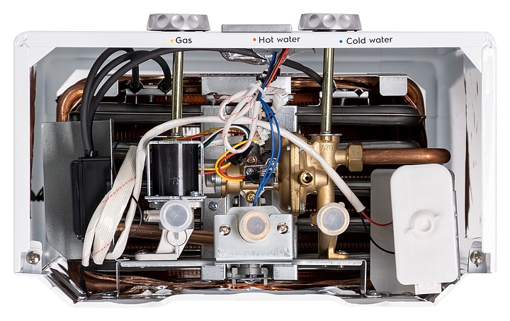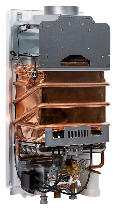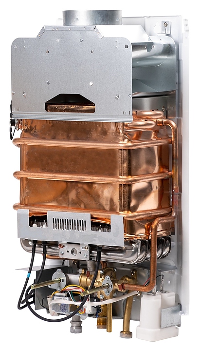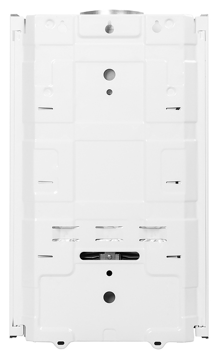 Газовый проточный водонагреватель Royal Thermo GWH 10 Eclipse используется в местных системах водоснабжения для постоянного автономного обеспечения горячей водой одной или нескольких точек водоразбора таких как санитарные узлы, кухни в жилых и загородных частных домах, а также на других бытовых и хозяйственных объектах. Модель оснащена газовой горелкой, теплообменником, коллектором дымовых газов с отверстием дымохода сверху, резьбовыми штуцерами для подключения газа, подвода холодной и выхода горячей воды, отсеком для батарей и расположенной на фасаде электромеханической панелью управления со светодиодным цифровым дисплеем с белой подсветкой индикации. Вертикально ориентированный корпус прямоугольного сечения выполнен из металла с антикоррозийным покрытием белого цвета, панель управления и переключатели с поверхностью серебристого оттенка.