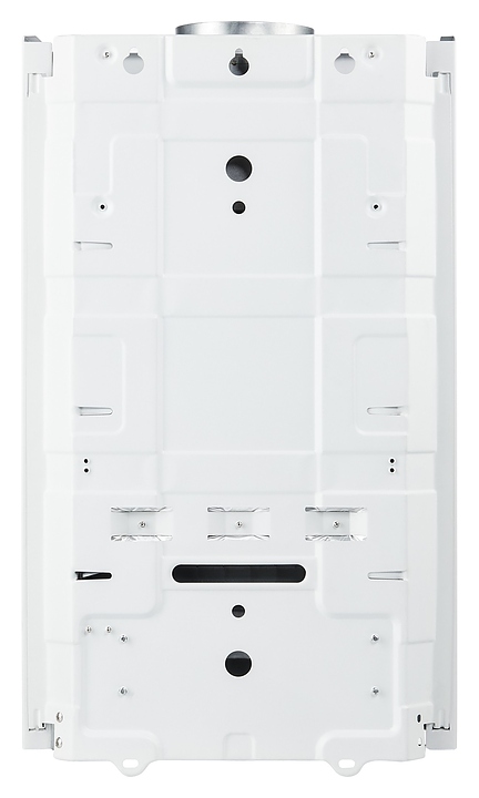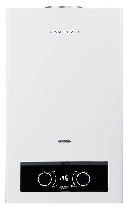 Газовый проточный водонагреватель Royal Thermo GWH 11 Royce White используется в местных системах водоснабжения для постоянного автономного обеспечения горячей водой одной или нескольких точек водоразбора таких как санитарные узлы, кухни в жилых и загородных частных домах, а также на других бытовых и хозяйственных объектах. Модель оснащена газовой горелкой, теплообменником, коллектором дымовых газов с отверстием дымохода сверху, резьбовыми штуцерами для подключения газа, подвода холодной и выхода горячей воды, отсеком для батарей и расположенной на фасаде электромеханической панелью управления со светодиодным цифровым дисплеем с белой подсветкой индикации. Вертикально ориентированный корпус прямоугольного сечения выполнен из металла с антикоррозийным покрытием белого цвета, панель управления и переключатели с поверхностью черного цвета.