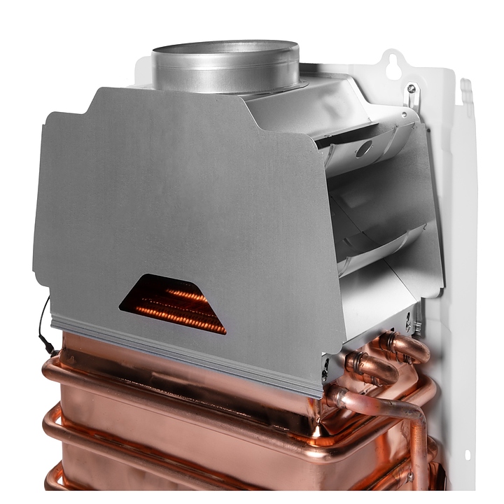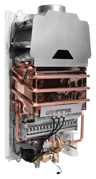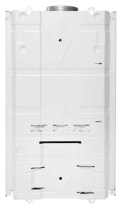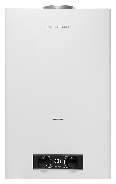 Газовый проточный водонагреватель Royal Thermo GWH 14 Inflame используется в местных системах водоснабжения для постоянного автономного обеспечения горячей водой одной или нескольких точек водоразбора таких как санитарные узлы, кухни в жилых и загородных частных домах, а также на других бытовых и хозяйственных объектах. Модель оснащена газовой горелкой, теплообменником, коллектором дымовых газов с отверстием дымохода сверху, резьбовыми штуцерами для подключения газа, подвода холодной и выхода горячей воды, отсеком для батарей и расположенной на фасаде электромеханической панелью управления со светодиодным цифровым дисплеем с белой подсветкой индикации. Вертикально ориентированный корпус прямоугольного сечения выполнен из металла с антикоррозийным покрытием белого цвета, панель управления и переключатели с поверхностью черного цвета.