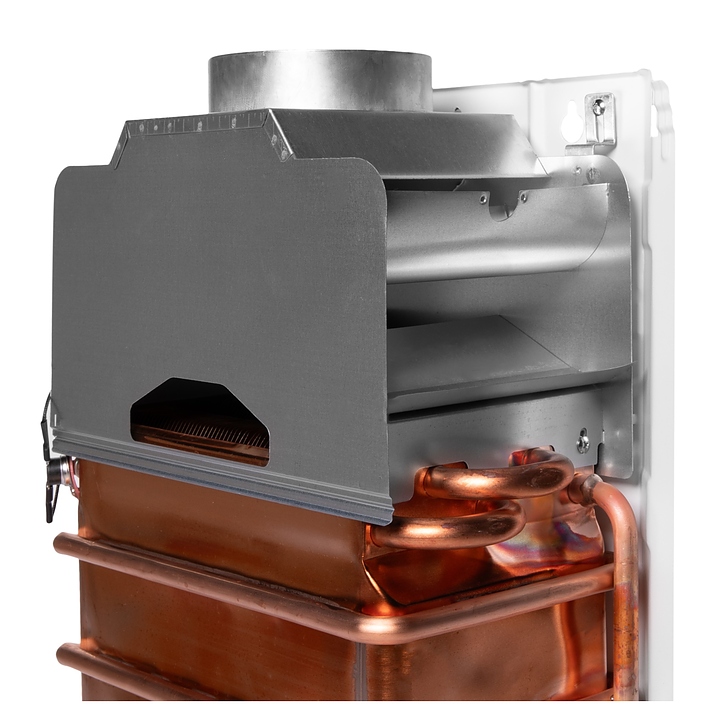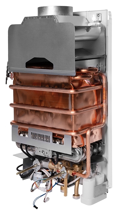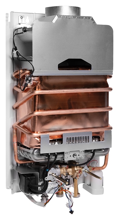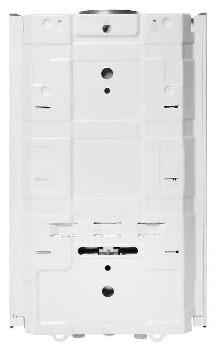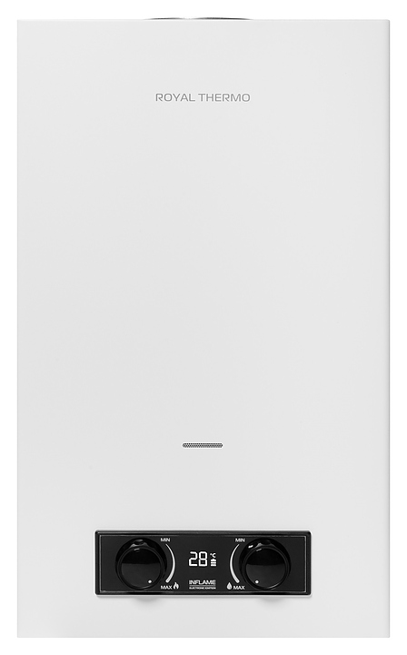 Газовый проточный водонагреватель Royal Thermo GWH 10 Inflame используется в местных системах водоснабжения для постоянного автономного обеспечения горячей водой одной или нескольких точек водоразбора таких как санитарные узлы, кухни в жилых и загородных частных домах, а также на других бытовых и хозяйственных объектах. Модель оснащена газовой горелкой, теплообменником, коллектором дымовых газов с отверстием дымохода сверху, резьбовыми штуцерами для подключения газа, подвода холодной и выхода горячей воды, отсеком для батарей и расположенной на фасаде электромеханической панелью управления со светодиодным цифровым дисплеем с белой подсветкой индикации. Вертикально ориентированный корпус прямоугольного сечения выполнен из металла с антикоррозийным покрытием белого цвета, панель управления и переключатели с поверхностью черного цвета.