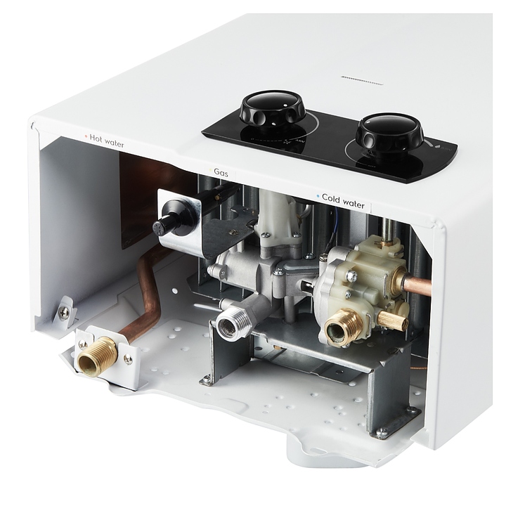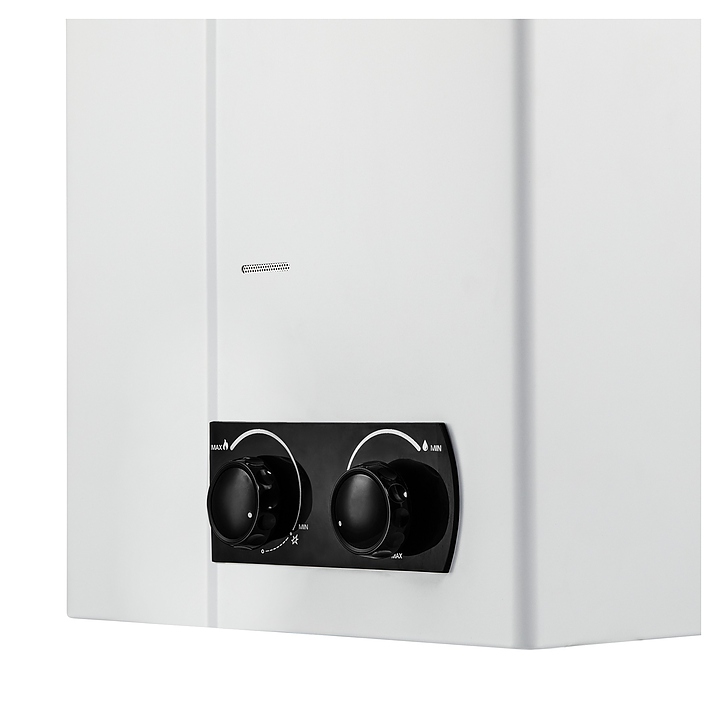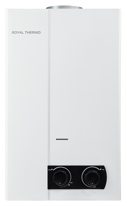 Газовый проточный водонагреватель Royal Thermo GWH 11 Piezo Pro используется в местных системах водоснабжения для постоянного автономного обеспечения горячей водой одной или нескольких точек водоразбора таких как санитарные узлы, кухни в жилых и загородных частных домах, а также на других бытовых и хозяйственных объектах. Модель оснащена газовой горелкой, теплообменником, коллектором дымовых газов с отверстием дымохода сверху, резьбовыми штуцерами для подключения газа, подвода холодной и выхода горячей воды и расположенной на фасаде механической панелью управления. Вертикально ориентированный корпус прямоугольного сечения выполнен из металла с антикоррозийным покрытием белого цвета, панель управления и переключатели с поверхностью черного цвета.