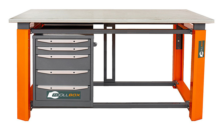 Верстак слесарный однотумбовый КМК ЗАВОД TOOLLBOX Premium ТВР 1800(ТВ5) используется для столярных, слесарных, ремонтных и сборочных работ. Предназначен для мастерских, гаражей и производственных помещений, где требуется надёжная рабочая поверхность без лишних элементов. Наличие одной тумбы позволяет размещать верстак в небольших помещениях или использовать пространство под столешницей для хранения крупных инструментов. Каркас верстака TOOLBOX включает в себя массивные опоры из 1,5 мм стали с возможностью установки регулируемых ножек и поперечины из стальной профильной трубы 40х40 мм. Столешница изготовлена из фанеры 30мм и закрыта стальным оцинкованным листом 1,2 мм, тумба с 5 ящиками из металла с порошковым покрытием. Поставка каркаса верстака, столешниц осуществляется в разобранном виде. Комплектация:
