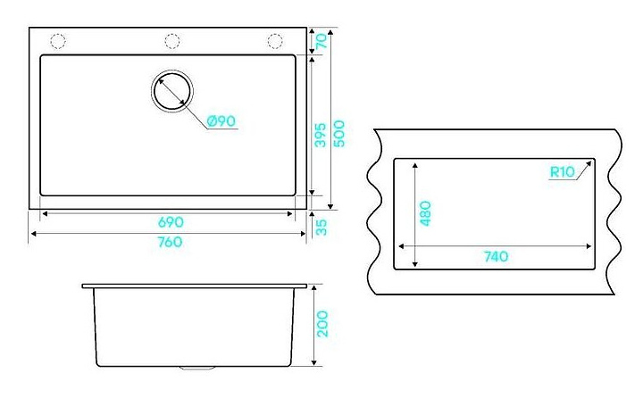 Кухонная мойка KUCHENSTERN 205BL20 OBEN 80 α-Granit 760х500х200 мм черный