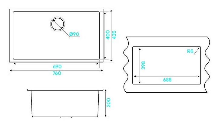 Кухонная мойка KUCHENSTERN 202BL20 SUB 80 α-Granit 760х435х200 мм черный