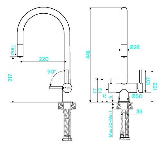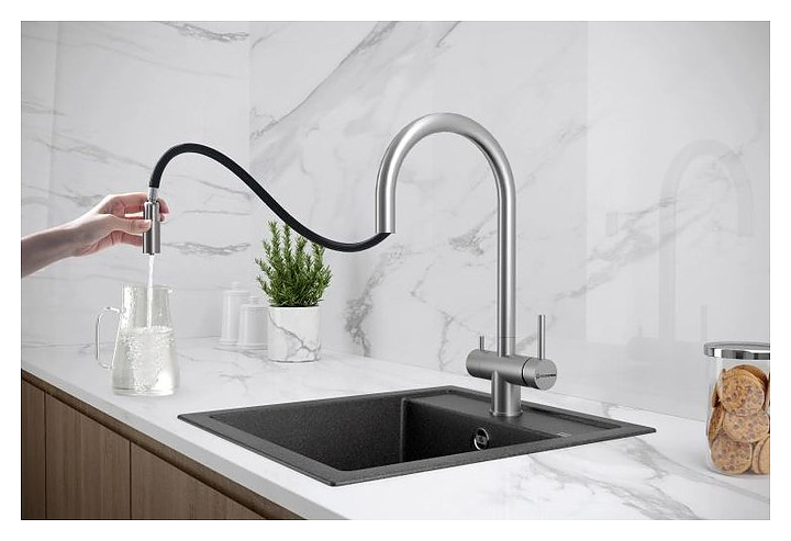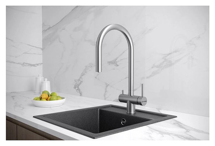Смеситель Kuchenstern DRIM-FS 403SS40 для кухонной мойки объединяет сразу две функции - питьевая и обычная вода, идеально сочетаются с мойками Kuchenstern. Модель имеет два отдельных рычага управления для водопроводной и фильтрованной воды. Смеситель изготовлен из стали SUS 304, которая отличается превосходной прочностью и антикоррозийной стойкостью, устойчивостью к механическим повреждениям и резким перепадам температур, абсолютной пищевой безопасностью. Неоспоримым преимуществом смесителей из стали SUS 304 является эстетичный и современный внешний вид. Комплектация:
