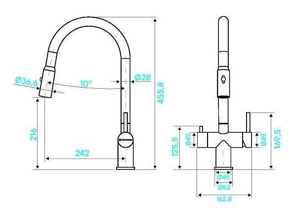 Смеситель Kuchenstern BRUNN-FS 751GM80 для кухонной мойки, идеально сочетается с мойками Kuchenstern. Модель оснащена аэратором , который равномерно смешивает и уменьшает расход воды, а также рычаг управления для водопроводной воды. Смеситель изготовлен из стали SUS 304, которая отличается превосходной прочностью и антикоррозийной стойкостью, устойчивостью к механическим повреждениям и резким перепадам температур, абсолютной пищевой безопасностью. Неоспоримым преимуществом смесителей из стали SUS 304 является эстетичный и современный внешний вид. Цветные модели KÜCHENSTERN с PVD покрытием обладают повышенной износостойкостью, Комплектация: