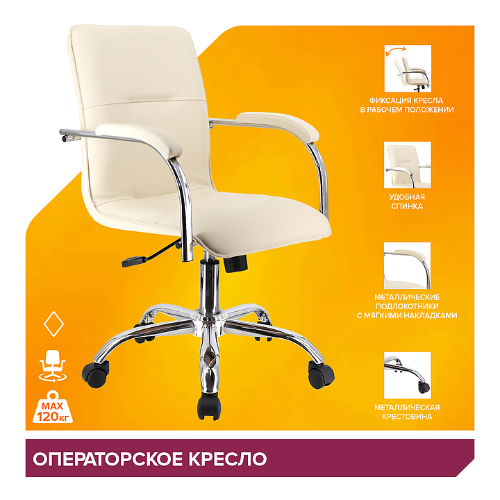 Кресло Everprof Samba T предназначено для меблировки офисов и современных домашних кабинетов. Модель оснащена подлокотниками. Механизм качания ТопГан позволяет плавно отклоняться назад и фиксировать кресло в рабочем положении. Ролики для паркета гарантируют надежность и защиту напольного покрытия. Обивка и накладки на подлокотниках выполнены из экокожи Pegaso, наполнитель - из вспененного полиуретана, крестовина - из хромированного металла. Особенности:
