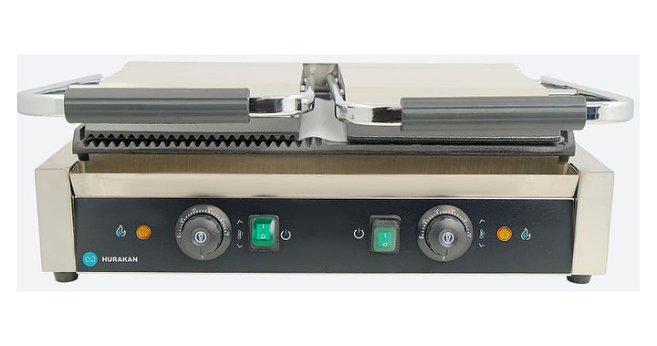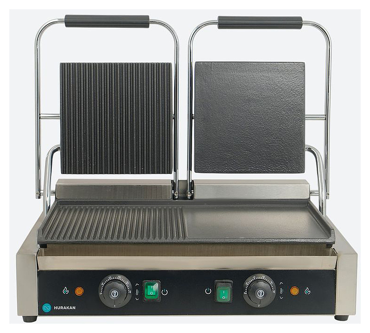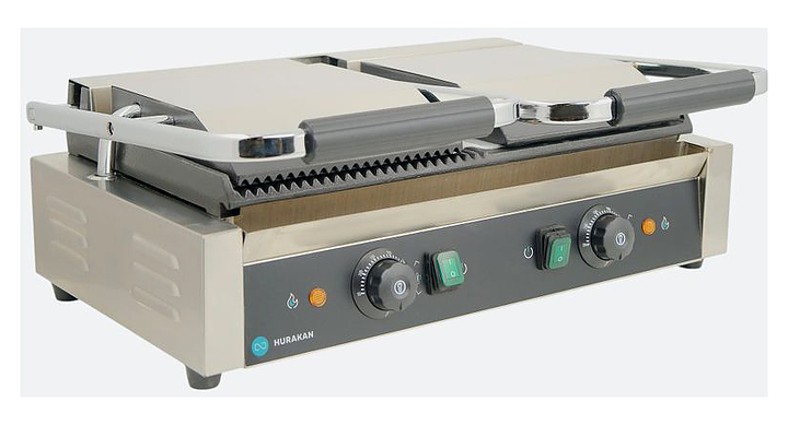 Прижимной гриль Hurakan HKN-PE44MT предназначен для обжаривания стейков и сосисок, приготовления сэндвичей, полуфабрикатов, подогрева булочек, гамбургеров, хот-догов на предприятиях общественного питания и торговли. Высокая скорость приготовления достигается благодаря встроенным в обе части аппарата тепловым элементам, которые плотно прилегают к продукту. Модель оснащена регулируемыми термостатами, индикаторами нагрева и лотком для сбора жира. Корпус выполнен из нержавеющей стали. Видео