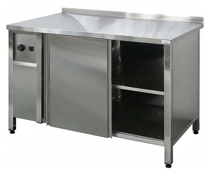Тепловой стол Finist СТ-12/7 предназначен для подогрева посуды перед сервировкой и сохранения температуры выложенных на тарелки блюд в горячих цехах и на линиях раздачи. Модель оснащена электромеханическим управлением, ТЭНом, тепловентилятором, дверьми-купе и перфорированной полкой, обеспечивающей равномерную вентиляцию внутреннего пространства. Корпус и двери-купе выполнены из нержавеющей стали. Дополнительные характеристики: