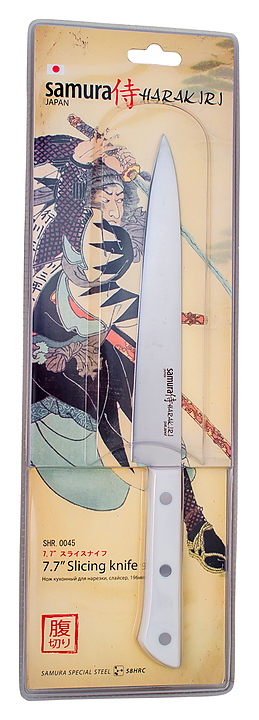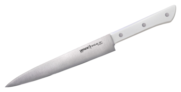 Японский кухонный нож Samura Harakiri SHR-0045W/K предназначен для филигранной нарезки различных продуктов на предприятиях общественного питания и торговли, в частных домах и квартирах. Узкое и длинное лезвие необычной формы позволяет создавать тончайшие порционные кусочки. Лезвие выполнено из коррозионно-стойкой однослойной стали AUS-8, ручка - из ABS-пластика. Особенности: