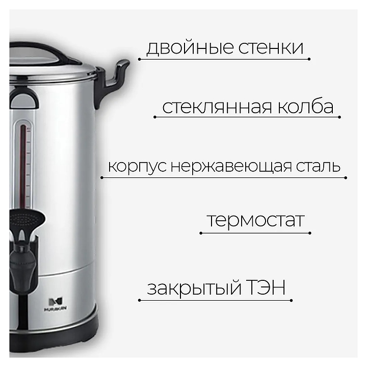 Кофеварка-перколятор Hurakan HKN-PCR06 используется на предприятиях общественного питания и торговли для приготовления и раздачи кофе и чая, нагрева большого количества воды. Модель оснащена индикатором нагрева, встроенным термостатом и защитой от перегрева. Корпус, стенки и внутренние элементы выполнены из нержавеющей стали. В комплект поставки входит перколяторная трубка для кипятка и фильтр для кофе. Особенности:
