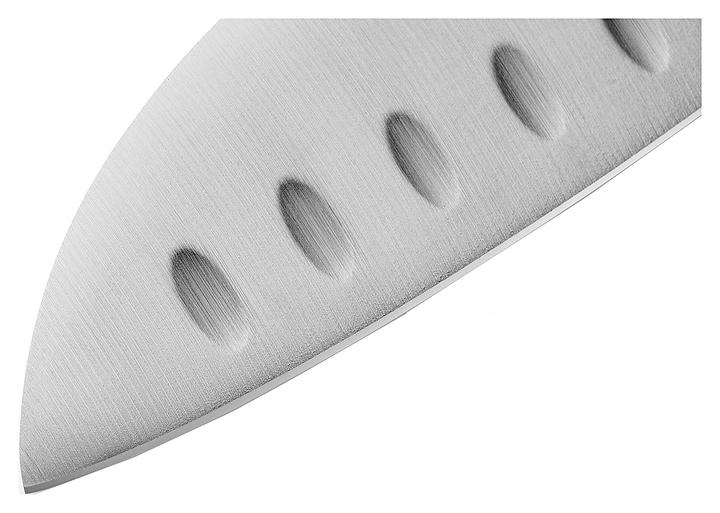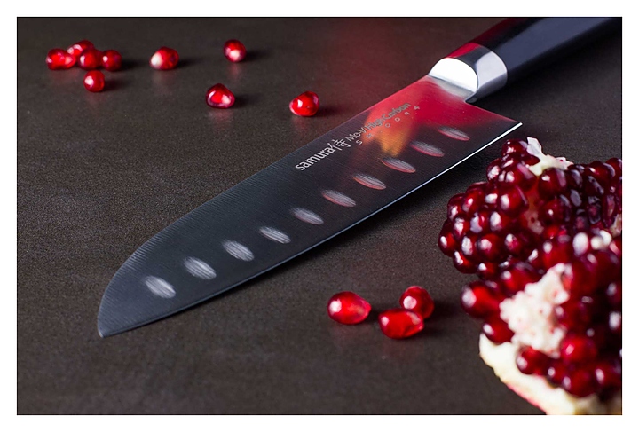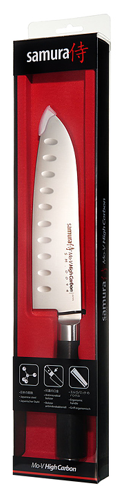 Нож Сантоку Samura Mo-V SM-0094/K предназначен для рубки, нарезки и шинковки различных продуктов на предприятиях общественного питания и торговли, в частных домах и квартирах. Тонкое лезвие обеспечивает его быстрое проникновение в мясо, при этом не давит и не выжимает сок. Лезвие выполнено из нержавеющей коррозионно-стойкой однослойной молибде-ванадиевой стали AUS-8, ручка - из стеклоткани G-10. Особенности:
