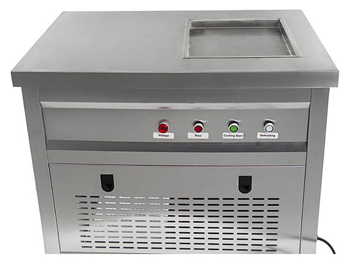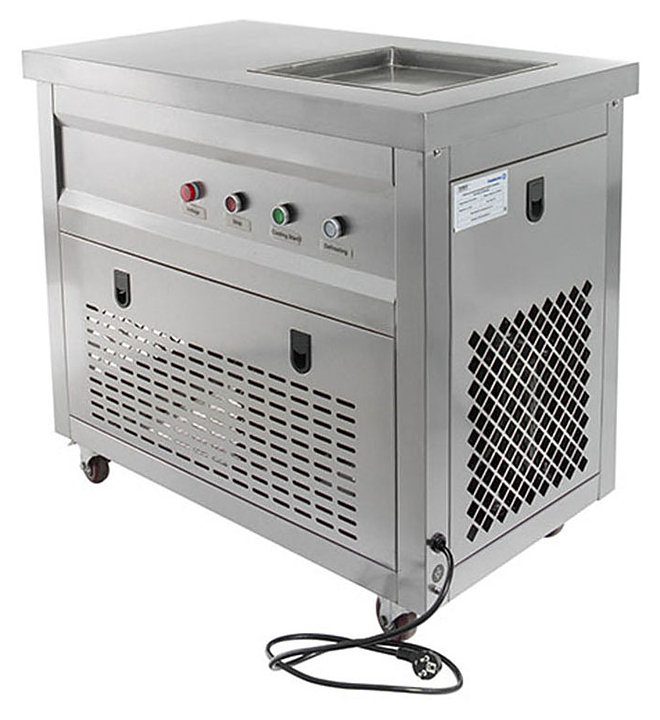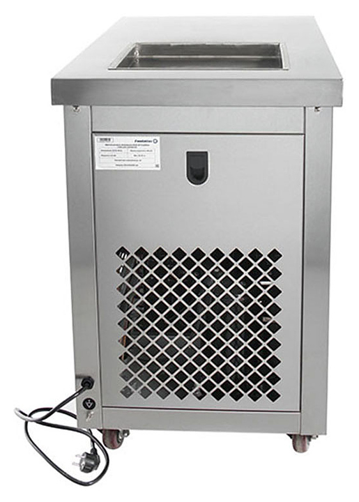 Фризер для мороженого Foodatlas KCB-1F используется на предприятиях общественного питания и торговли для приготовления жареного мороженого в роллах. Модель оснащена механическим управлением, столом для топпиногов, световым коробом, квадратной охлаждаемой поверхностью для "жарки" десерта при минусовой температуре и 4 колесами, 2 из которых снабжены тормозом. Корпус выполнен из нержавеющей стали 430, сковорода - из нержавеющей стали 304, радиатор - из алюминия, каркас светового короба - из оргстекла, полотно светового короба - из ПВХ. Особенности:
