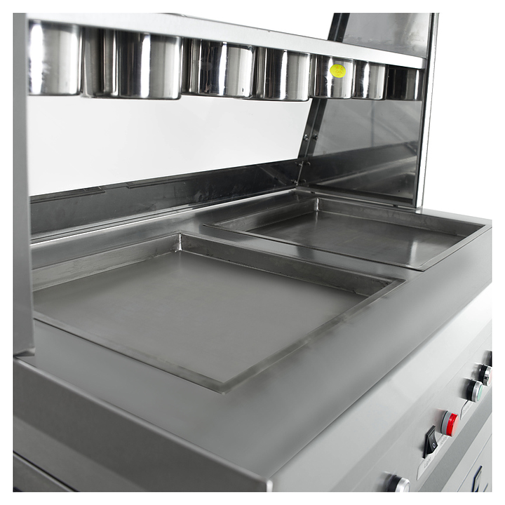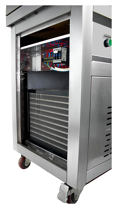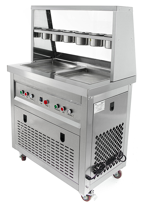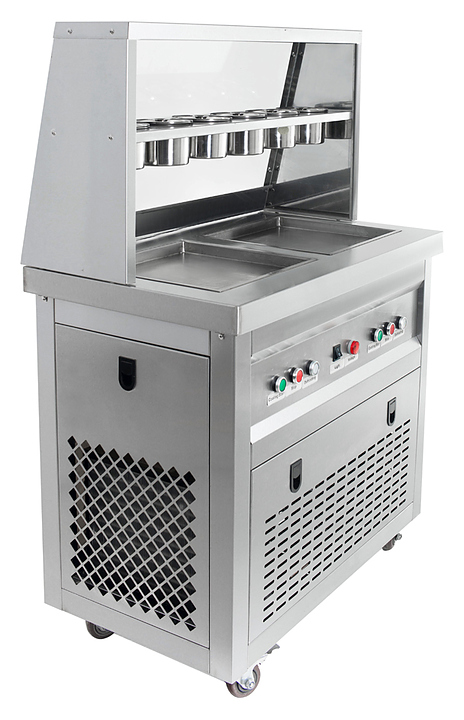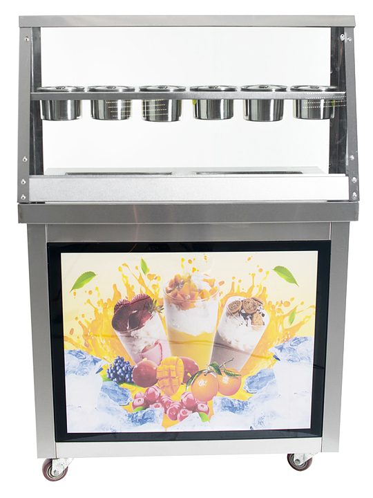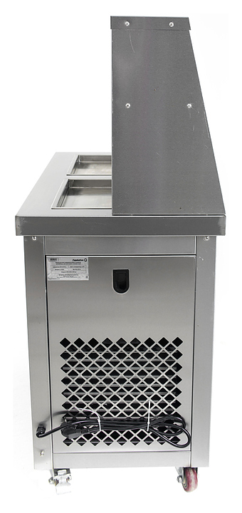Фризер для мороженого Foodatlas KCB-2F используется на предприятиях общественного питания и торговли для приготовления жареного мороженого в роллах. Модель оснащена механическим управлением, 6 квадратными контейнерами, световым коробом, 2 квадратными охлаждаемыми поверхностями для "жарки" десерта при минусовой температуре и 4 колесами, 2 из которых снабжены тормозом. Корпус выполнен из нержавеющей стали 430, сковорода и контейнеры - из нержавеющей стали 304, радиатор - из алюминия, каркас светового короба - из оргстекла, полотно светового короба - из ПВХ. Особенности: