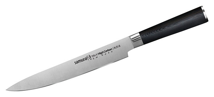 Японский нож Samura Mo-V SM-0045/K предназначен для нарезки колбасы и сыра на аккуратные ломтики на предприятиях общественного питания и торговли, в частных домах и квартирах. Тонкое лезвие обеспечивает его быстрое проникновение в мясо, при этом не давит и не выжимает сок. Лезвие выполнено из нержавеющей коррозионно-стойкой однослойной молибде-ванадиевой стали AUS-8, ручка - из стеклоткани G-10. Особенности: