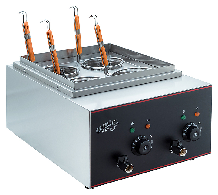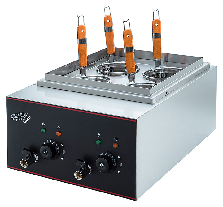 Макароноварка Crazy Pan CP-NC40 предназначена для приготовления различных продуктов в большом количестве воды на предприятиях общественного питания и торговли. Модель оснащена 2 группами нагрева, 2 терморегуляторами, 2 ТЭНами, 4 корзинами для варки пасты. Корпус выполнен из нержавеющей стали. Дополнительные характеристики: