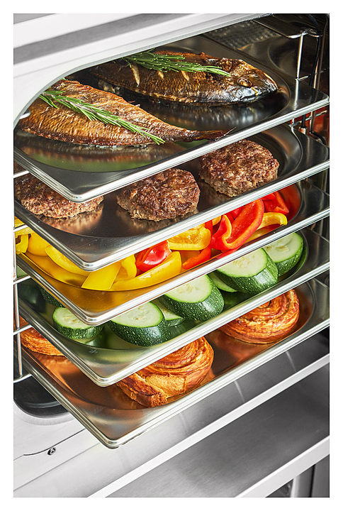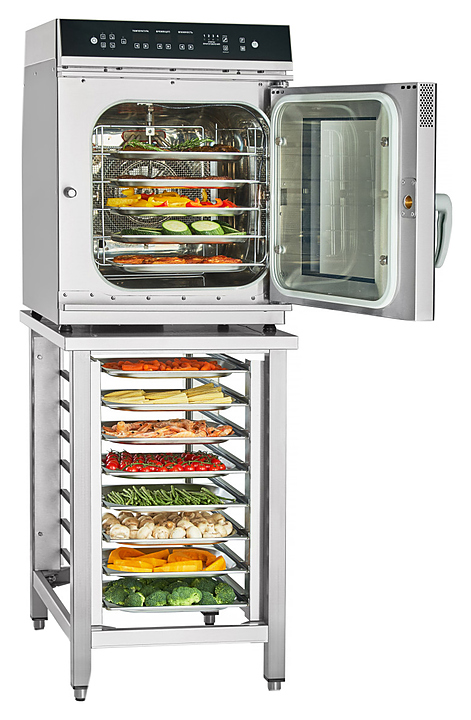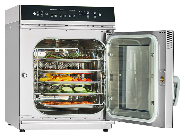 Пароконвектомат Abat ПКА 6-1/2В предназначен для обжаривания, приготовления на пару, бланширования, запекания и других видов тепловой обработки продуктов на предприятиях общественного питания и торговли. Оборудование заменяет сразу несколько видов приборов: плиту, конвекционную печь, жарочный шкаф, духовку, опрокидывающуюся сковороду, пищеварочный котел, фритюрницу и др. Приготовленные в пароконвектомате блюда сохраняют все полезные вещества. Модель оснащена подсветкой, легкосъемным жировым фильтром и дверью с двойным остеклением. Пароконвектомат используется совместно с вытяжным зонтом Abat ЗВВ-700В, ЗВВ-700. Благодаря небольшим габаритным размерам пароконвектомат подходит для помещений с ограниченным пространством и размещается на столе или подставке. Корпус и внутренняя отделка выполнены из высококачественной нержавеющей стали. Рекомендуется дополнительно приобрести водоумягчитель и фильтр-систему для очистки и смягчения воды. Подробнее о необходимости водоподготовки читайте здесь. Особенности: