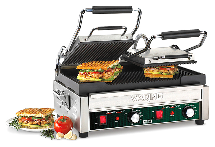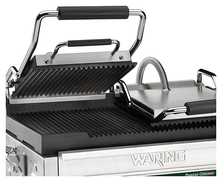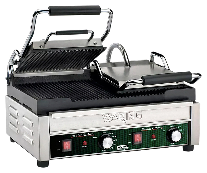 Прижимной гриль Waring WPG300 предназначен для приготовления стейков, гамбургеров и горячих сэндвичей, а также для жарки мяса, птицы, рыбы и овощей на предприятиях общественного питания, торговли и в домашних условиях. Модель оснащена 2 регулируемыми термостатами и съемным лотком для сбора жира, масла и остатков пищи. Корпус выполнен из матовой нержавеющей стали. Особенности: