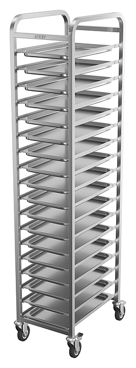 Тележка-шпилька ATESY КШ-Л-1.18-1.1-02 серии Люкс используется на предприятиях общественного питания и торговли для транспортировки и хранения гастроемкостей. Модель оснащена 4 поворотными колесами, 2 из которых снабжены тормозными устройствами. Сварная конструкция полностью выполнена из нержавеющей стали AISI 304. Особенности: