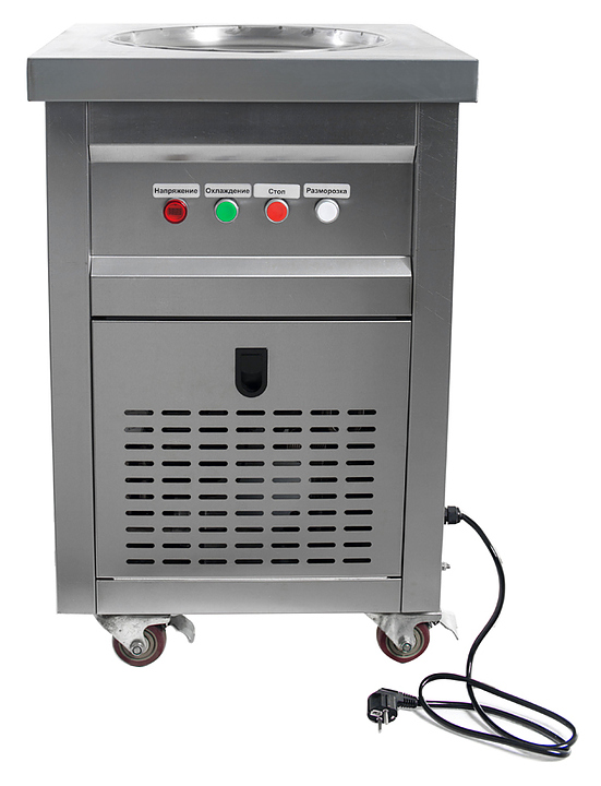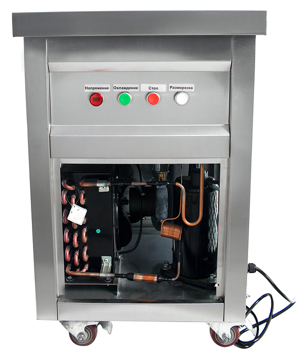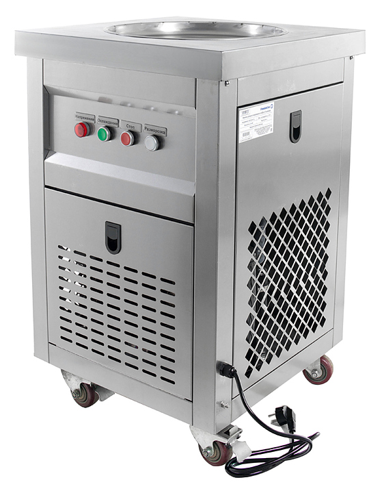 Фризер для мороженого Foodatlas KCB-1Y используется на предприятиях общественного питания и торговли для приготовления жареного мороженого в роллах. Модель оснащена механическим управлением, термоконтроллером, круглой охлаждаемой поверхностью для "жарки" десерта при минусовой температуре и 4 колесами, 2 из которых снабжены тормозом. Корпус выполнен из нержавеющей стали 430, сковорода - из нержавеющей стали 304, радиатор - из алюминия. Особенности: