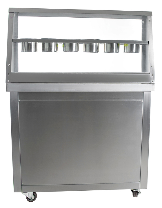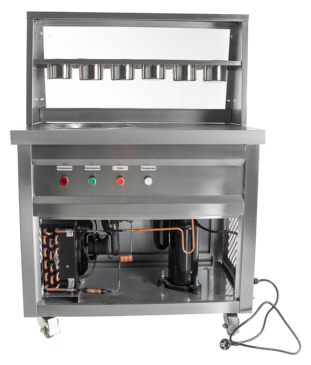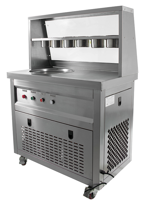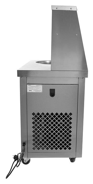 Фризер для мороженого Foodatlas KCB-1Y используется на предприятиях общественного питания и торговли для приготовления жареного мороженого в роллах. Модель оснащена механическим управлением, столом для топпиногов, 3 цилиндрическими контейнерами, квадратной охлаждаемой поверхностью для "жарки" десерта при минусовой температуре и 4 колесами, 2 из которых снабжены тормозом. Корпус выполнен из нержавеющей стали 430, сковорода и контейнеры - из нержавеющей стали 304, радиатор - из алюминия. Особенности: