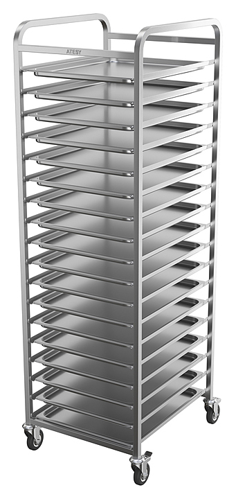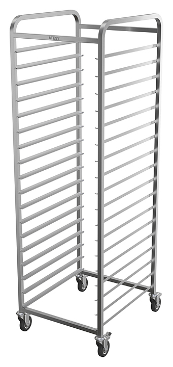 Тележка-шпилька ATESY КШ-С-1.18-2.1-02 серии Стандарт используется на предприятиях общественного питания и торговли для транспортировки и хранения гастроемкостей. Модель оснащена 4 поворотными колесами, 2 из которых снабжены тормозными устройствами. Разборная конструкция полностью выполнена из нержавеющей стали AISI 304. Особенности: