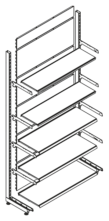 Стеллаж пристенный STAHLER серии Eco Line со сплошными металлическими полками для демонстрации продукции в магазине. Единая конструкция "стойка-база". Стеллаж комплектуется двумя полками глубиной 370 мм и двумя полками глубиной 310 мм. Комплектация:
