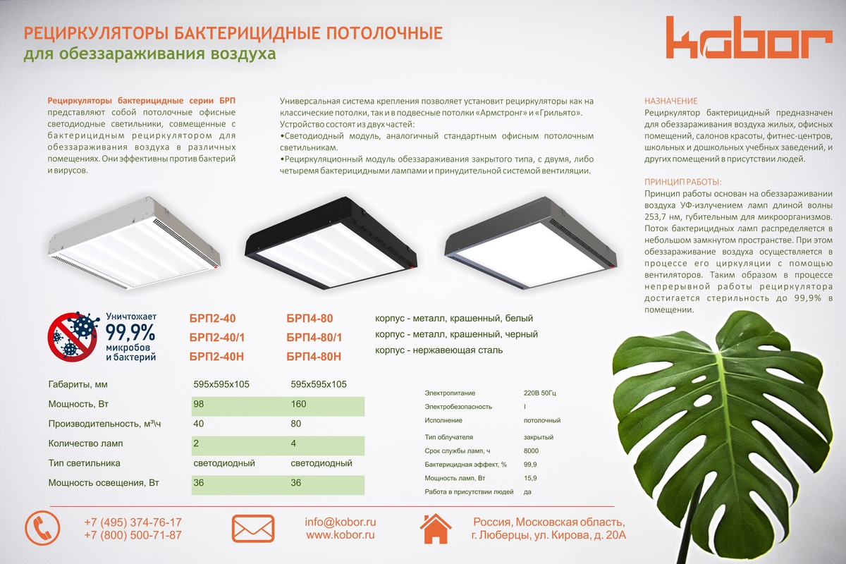 Бактерицидный рециркулятор Кобор БРП4-80/1 используется на предприятиях общественного питания и торговли, в офисах, образовательных и медицинских учреждениях, а также в других местах общественного пользования для обеззараживания воздуха в помещениях. Модель работает на 4 бактерицидных лампах, производящих ультрафиолетовое излучение, которое губительно влияет на практически все известные вирусы, болезнетворные бактерии и грибы. Корпус выполнен из крашеного металла. Особенности: