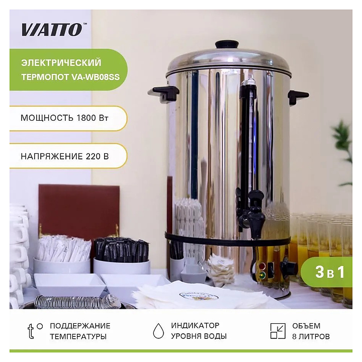 Кипятильник VIATTO VA-WB08SS предназначен для приготовления кипятка для варки гарниров, овощей, сосисок, пельменей и других продуктов питания, а также для заваривания и приготовления горячих напитков, стерилизации кухонной и столовой посуды, столовых приборов на предприятиях общественного питания и торговли. Модель оснащена закрытым нагревательным элементом. Корпус выполнен из нержавеющей стали. Особенности: