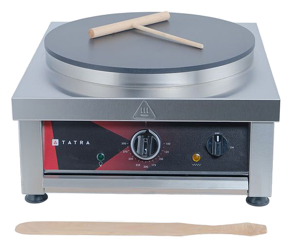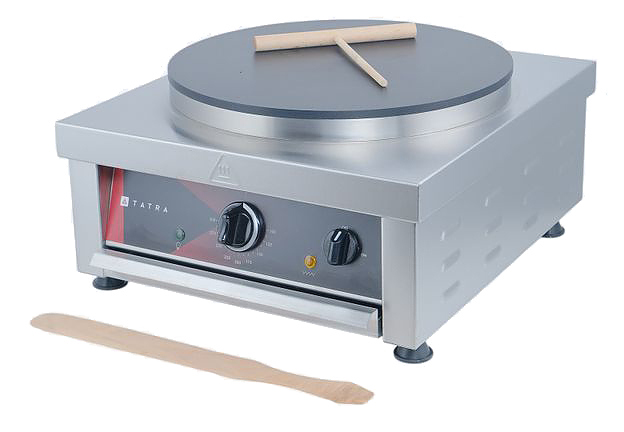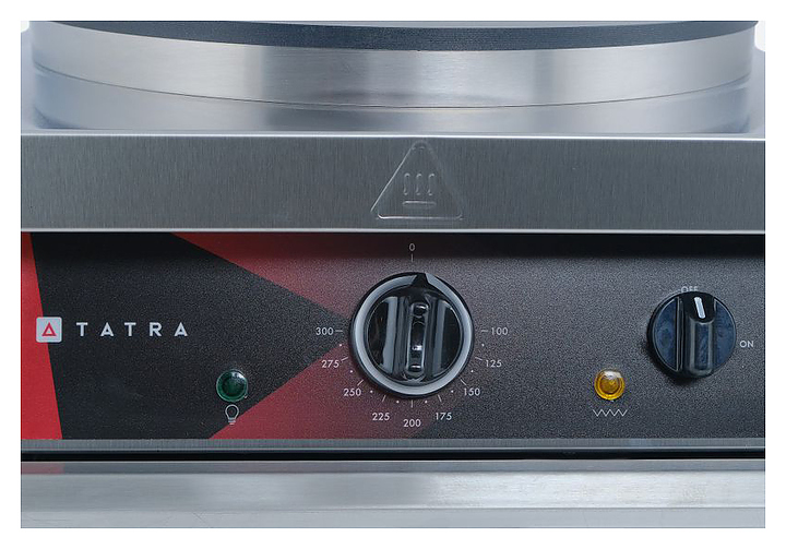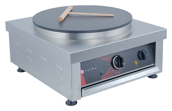 Блинница Tatra TCM S 40 предназначена для выпечки блинов на предприятиях общественного питания и торговли. Модель оснащена электромеханической панелью управления с терморегулятором и индикаторами питания и нагрева. Корпус выполнен из нержавеющей стали, жарочные поверхности из чугуна имеют антипригарное тефлоновое покрытие. Дополнительные характеристики: