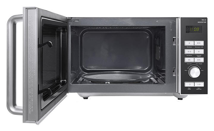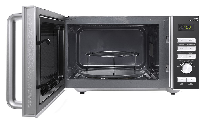 Инверторная микроволновая печь CASO MIG 25 предназначена для разогрева, размораживания и приготовления продуктов в частных домах, квартирах, отелях и офисах. Модель оснащена цифровым дисплем с часами. Передняя панель выполнена из зеркального стекла, внутреннее покрытие - из нержавеющей стали. В комплект поставки входит круглая решетка-подставка. Режимы работы: