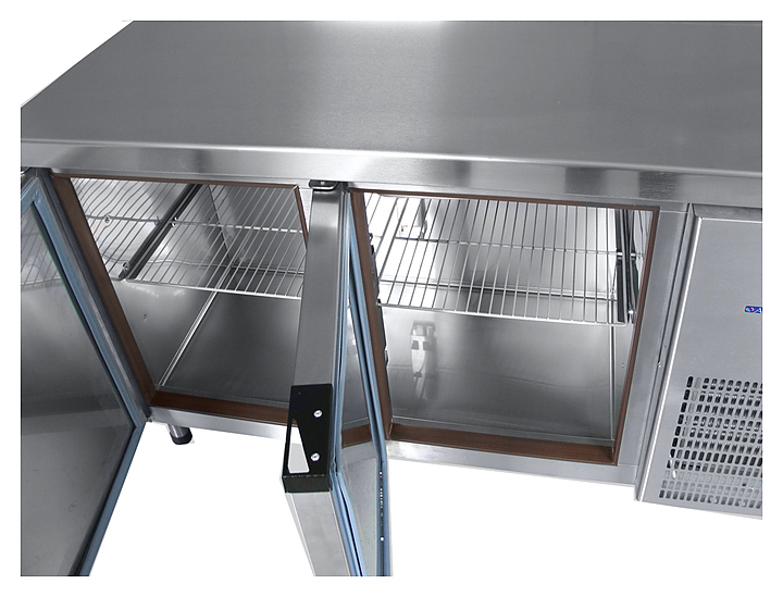 Холодильный стол Abat СХС-60-01 предназначен для раскатки теста, обработки ингредиентов для приготовления блюд, охлаждения и кратковременного хранения скоропортящихся продуктов и напитков на предприятиях общественного питания и торговли. Модель оснащена неохлаждаемой рабочей поверхностью, 2 распашными дверцами с уплотнителями с магнитной вставкой, 2 регулируемыми по высоте полками-решетками и регулируемыми по высоте ножками. Цельнозаливной корпус выполнен из высококачественной нержавеющей стали AISI 202 c пенополиуретановой изоляцией. Особенности: